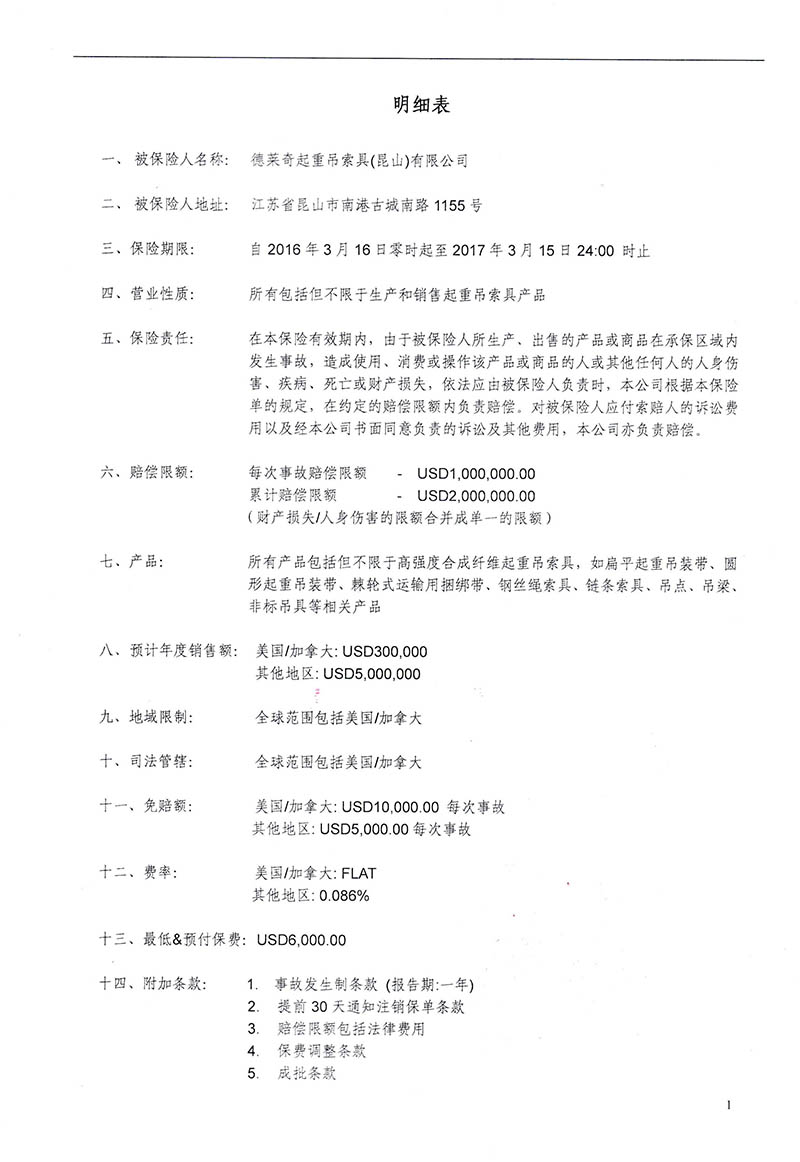德國多來勁吊具太平洋保險公司產(chǎn)品責(zé)任險